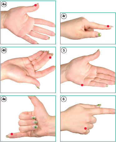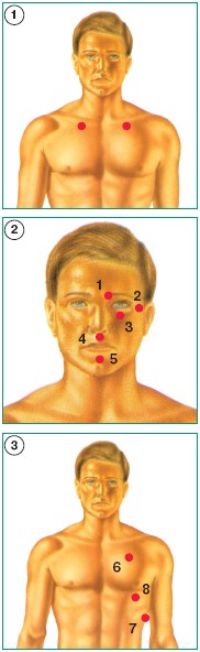 1. Начало брови 2. Уголок глаза 3. Под глазом как раз под зрачком 4. Под носом (точка памяти) 5. Середина подбородка 6. Под ключицей 7. Боковая часть тела 8. Под соском 9. Точки на пальцах (начиная с большого) и на ладони