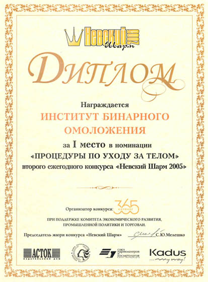 Институт бинарного омоложения завоевал I место в номинации «Процедуры по уходу за телом» Второго ежегодного конкурса «Невский Шарм 2005», который проходил этой осенью в Санкт-Петербурге. Церемония награждения победителей состоялась 3 ноября 2005 года. По итогам конкурса хотим поздравить нашего косметолога Султаналину Нажию с яркой победой в этой номинации. |
